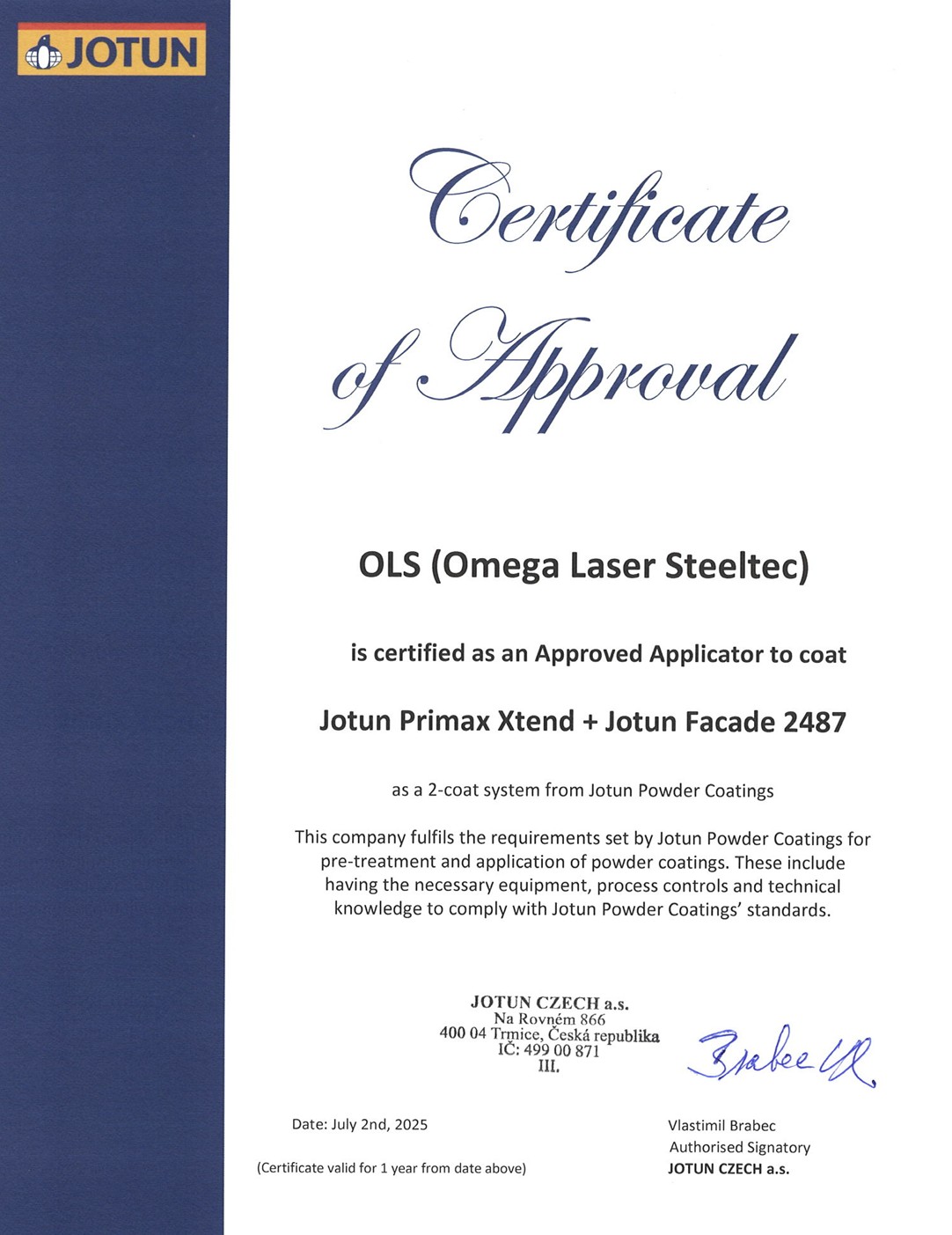 Az OLS Kft. sikeresen teljesítette a JAA Auditot (Jotun Approved Applicator). Az audit megfelel a Qualisteelcoat minősítő rendszer elvárásainak. Ez egy olyan nemzetközi minősítési rendszer, amelyet a vezető európai acélbevonat-gyártók és felületkezelő szakmai szervezetek hoztak létre annak érdekében, hogy egységes, átfogó és szigorú követelményrendszert biztosítsanak a horganyzott és festett acéltermékek minőségének garantálására.